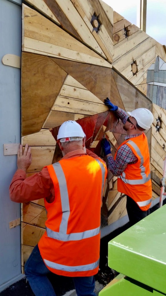 The tactile timber draws in the viewer to engage with the images, transforming the 2-dimensional planes into 3-dimensional images. The timber segments themselves are all salvaged timber provided by the construction site, that would’ve otherwise have been destined for the rubbish skip.