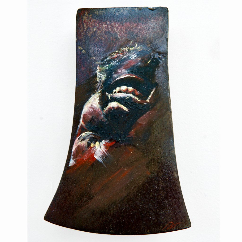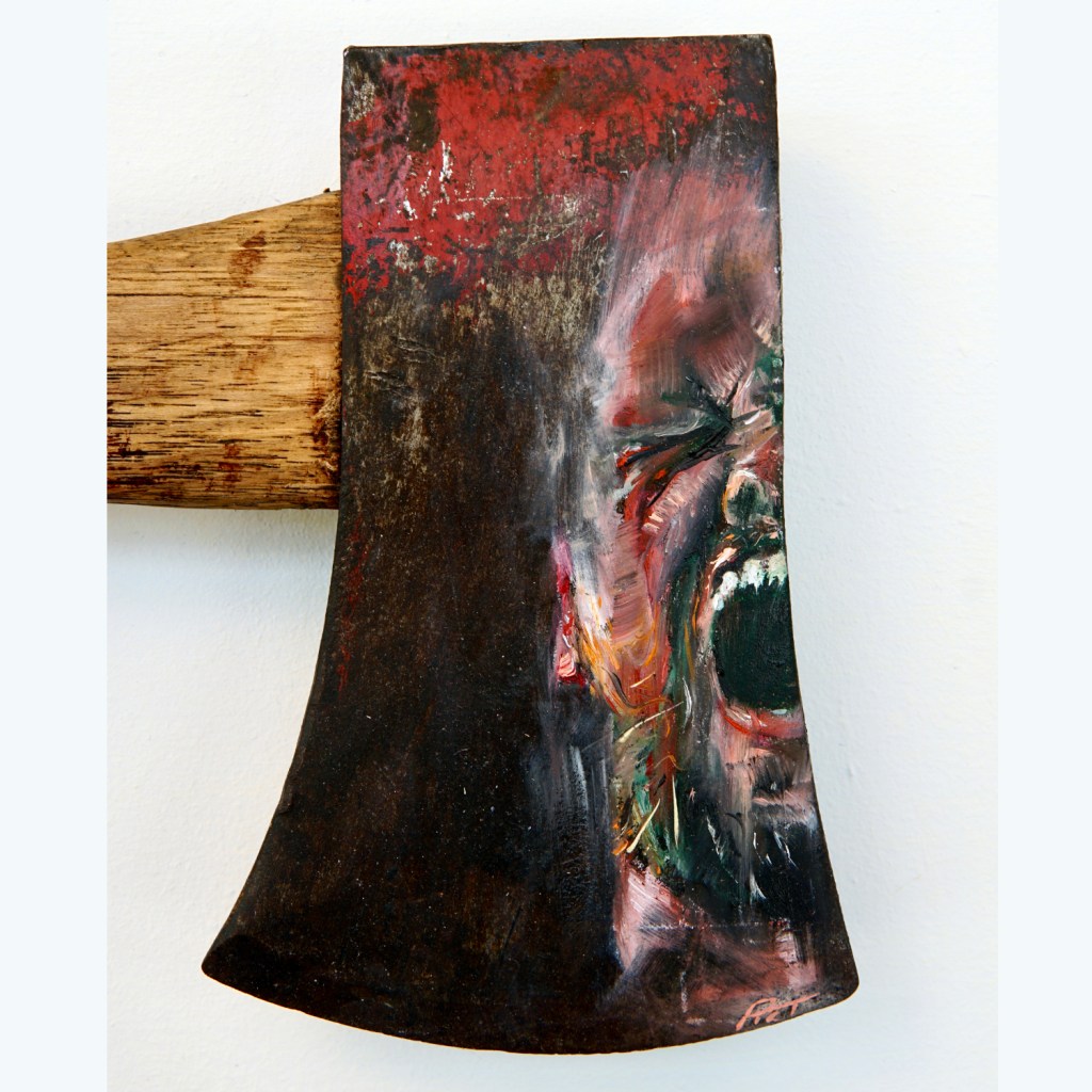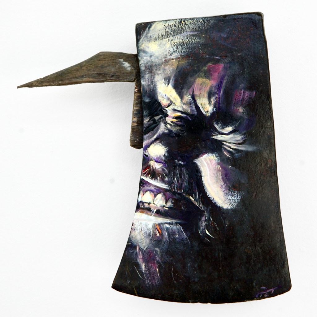 ‘Regicide’ is a polyptych series of 9 self-portrait ‘selfies’ painted directly onto axe blades. This violent artwork, a homage to the Old Masters’ grotesque portraits, serves as critique of the vanity in our modern self-promotion culture. This custom promotes narcissism and individualism over actual substance. As every person is a “King” of their own kingdom, I too struggle with social media induced vanity and guilt. Who doesn’t?