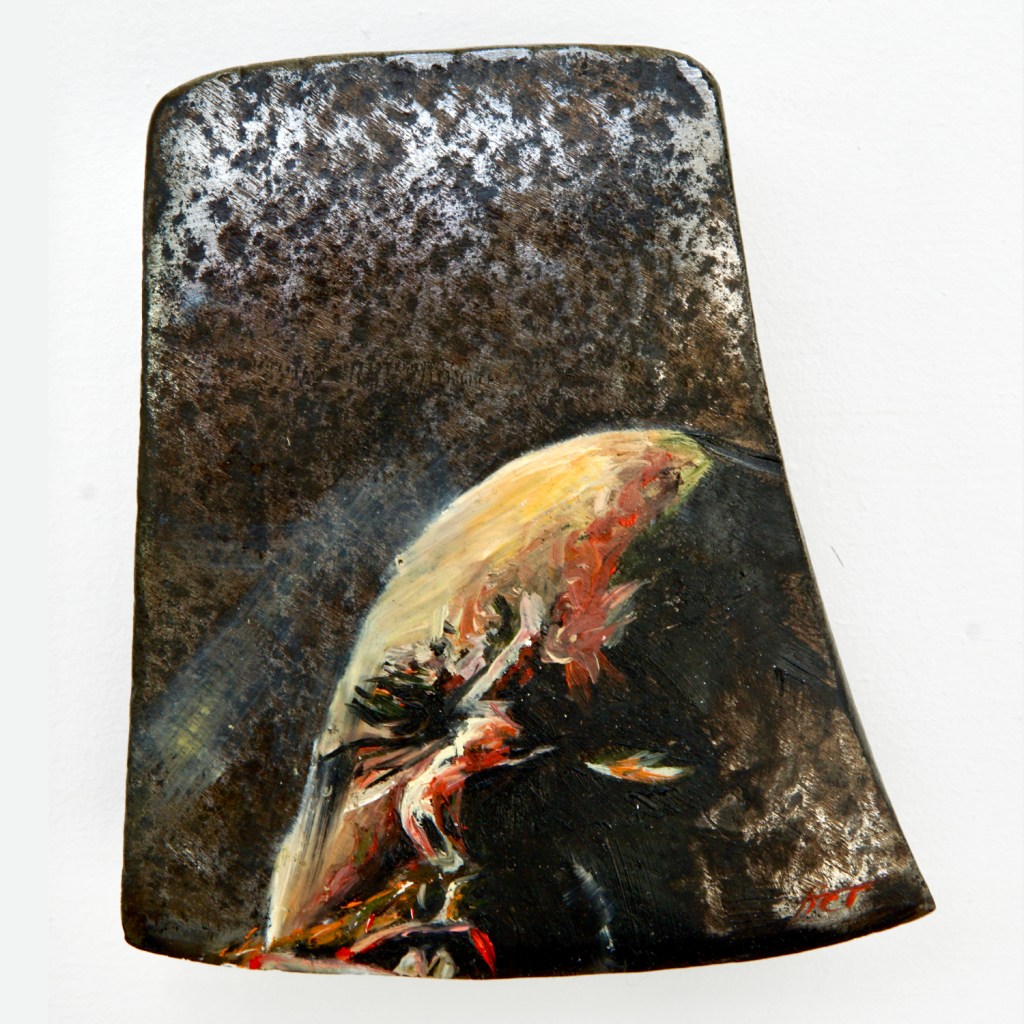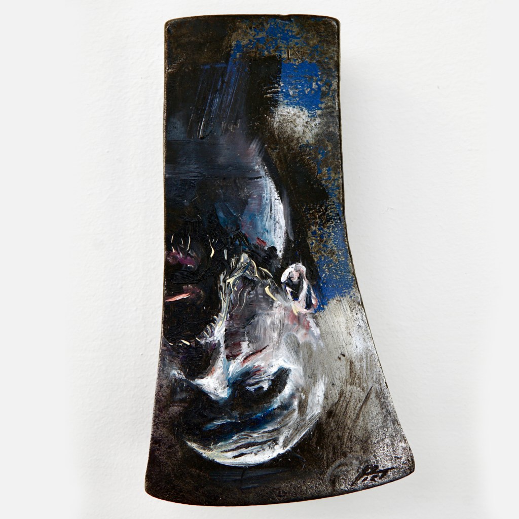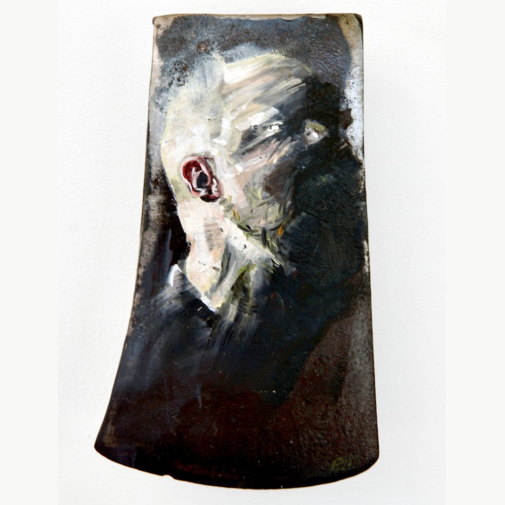 ‘Regicide’ is a polyptych series of 9 self-portrait ‘selfies’ painted directly onto axe blades. This violent artwork, a homage to the Old Masters’ grotesque portraits, serves as critique of the vanity in our modern self-promotion culture. This custom promotes narcissism and individualism over actual substance. As every person is a “King” of their own kingdom, I too struggle with social media induced vanity and guilt. Who doesn’t?